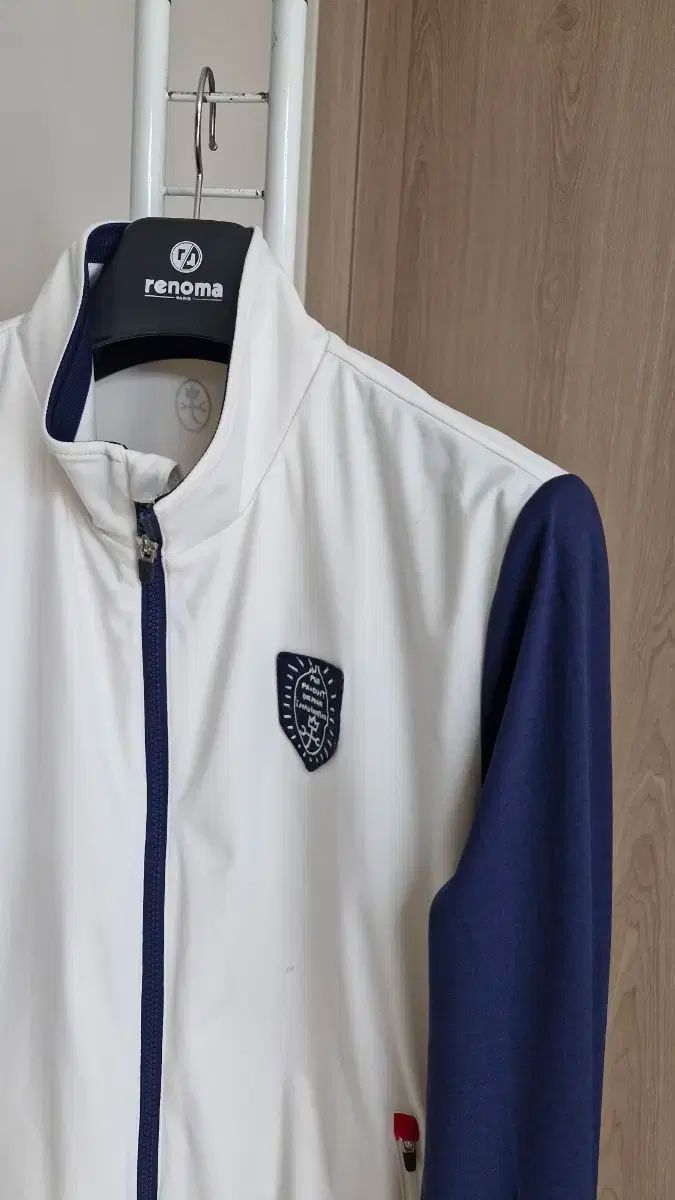 カステルバジャックメンズゴルフスパンジャケット、ホワイトカラー。サイズは100で、伸縮性のある素材で着心地もいいです。アームはネイビーカラーで洗練された印象に。