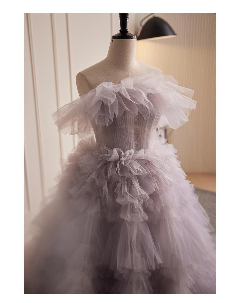 オフショルダー 背中あきウェディングドレス ティアード チュール