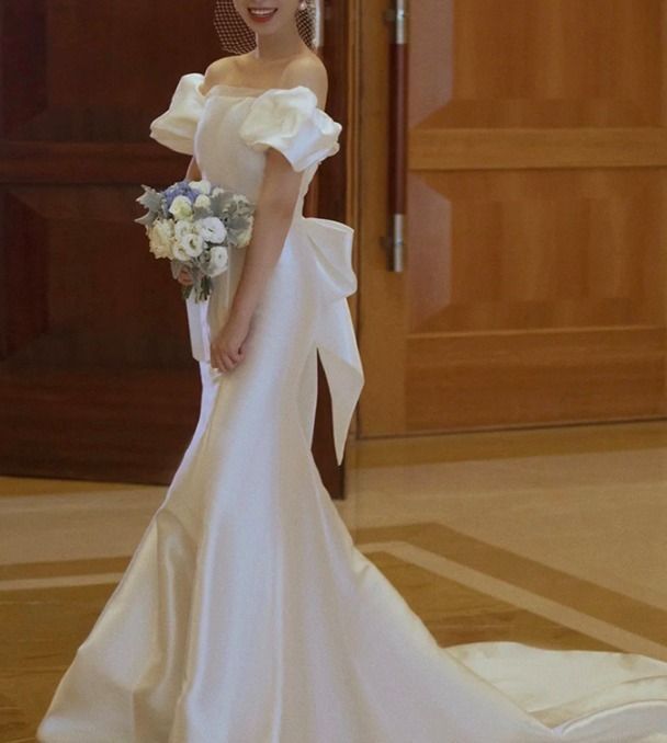ロング ウェディングドレス サテン フィッシュテール リボン