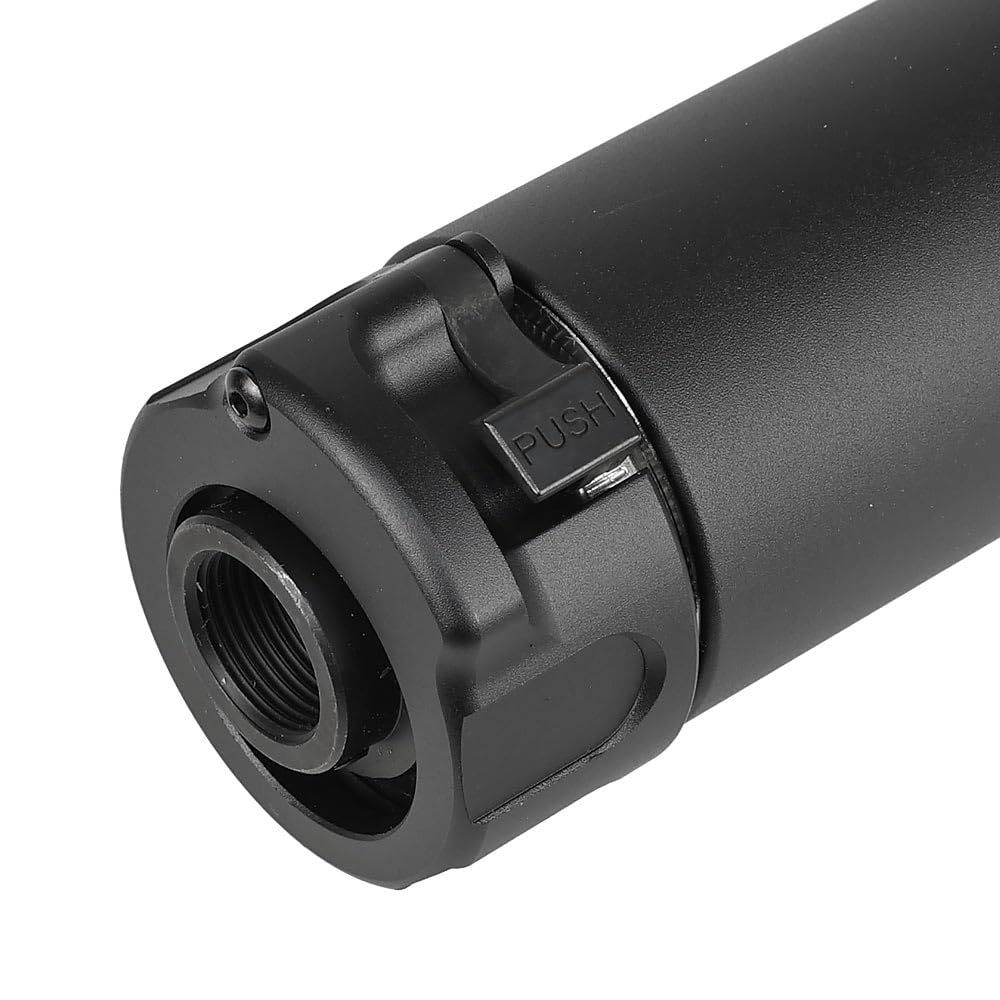 【Fast Attachシステムの再現】片手で素早くサイレンサーを脱着できるファストアタッチシステムがリアルに再現されています。 ■外し方 1. サイレンサーの根元にある「PUSH」ボタンを押し込みながら、ロックリングを反時計まわりに回します。 2. ロックリングを真上から覗き込み、フラッシュハイダーとピッタリ重なる位置で止めます。 3. フラッシュハイダーを引き抜きます。 ■取り付け方 1. ロックリングを反時計回りにまわしておきます。 2. フラッシュハイダーをサイレンサー内の切り欠きに合うよう差し込みます。このとき、奥まで差し込めるようロックリングの位置を調整してください。 3. ロックリングを時計まわりに回してロックします。