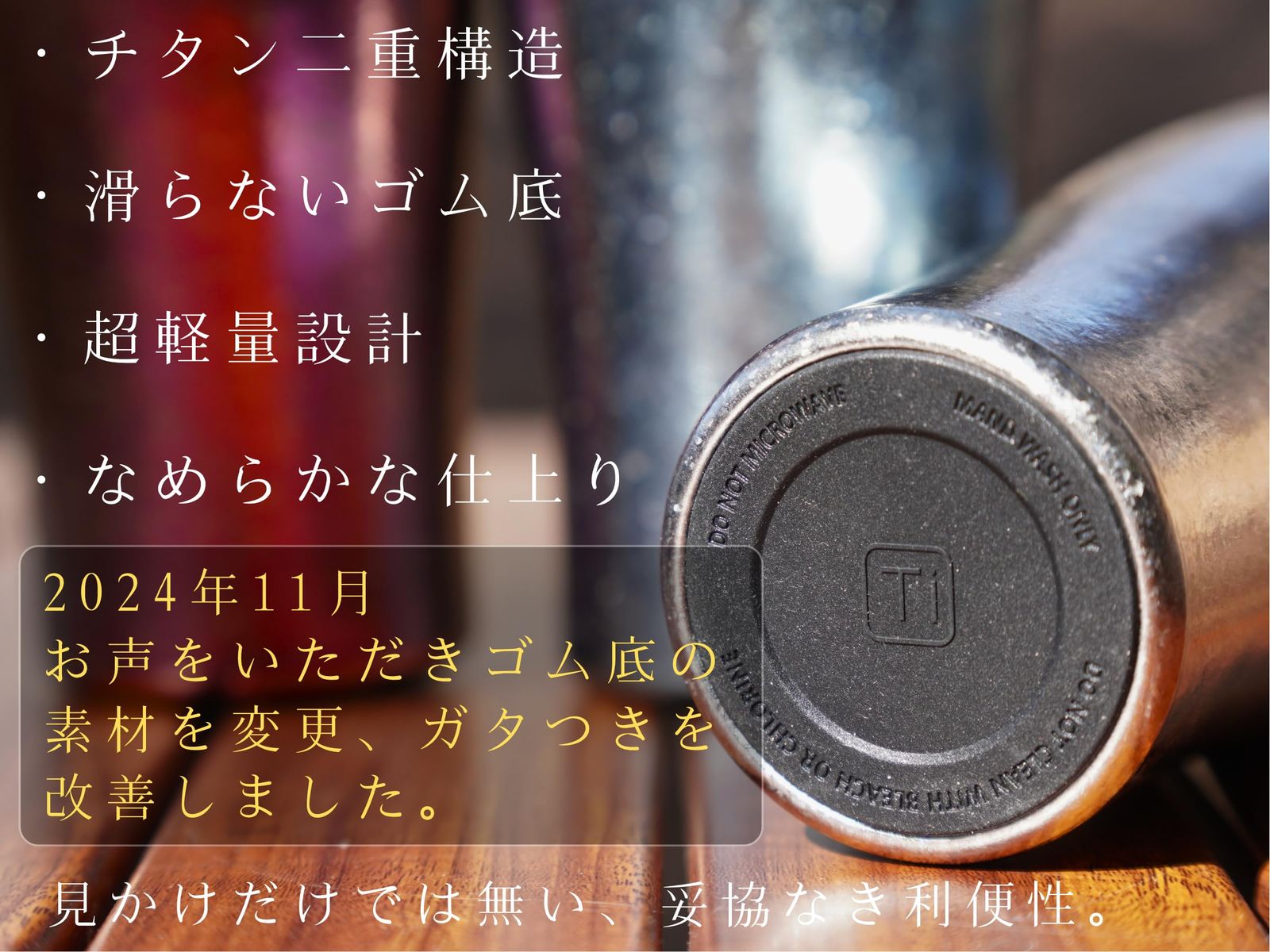 【こだわり】2024年11月にお客様のお声をいただき、底面の安定性を向上しました。この度はSEIDOのチタンタンブラーをご覧いただき誠にありがとうございます。SEIDOのタンブラーは手作業で丁寧にひとつひとつ作り上げています。チタンという希少金属を贅沢に使い、高級感を高めながら、使いやすい性能を妥協することなく作り上げました。