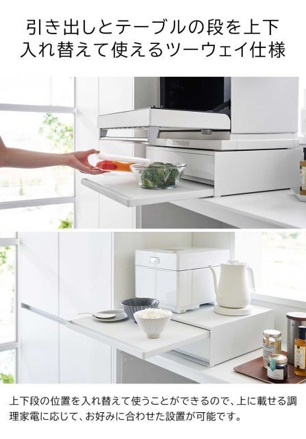 調理家電まわりで必要なラップ類やミトンなどが収まる収納力抜群の引き出しと、必要な時にだけサッと使えるテーブルの2段式ラックです。上下段の入れ替えが可能なツーウェイ設計だから、お好みに合わせてお使いいただけます。調理家電の下に設置すれば、キッチンの限られたスペースでもスマートに整理整頓ができます。
