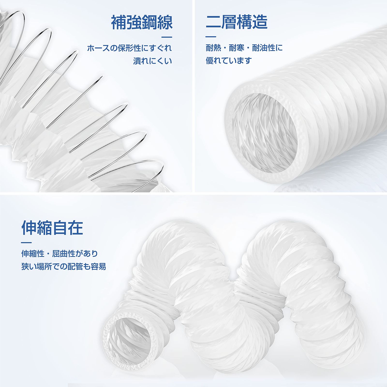 ?【補強鋼線&伸縮自在】伸縮性・屈曲性があり、狭い場所での配管も容易です。錆びにくい補強鋼線が内蔵されているため、潰れにくく曲げ保形性に優れます。耐熱・耐寒・耐油性に優れています。