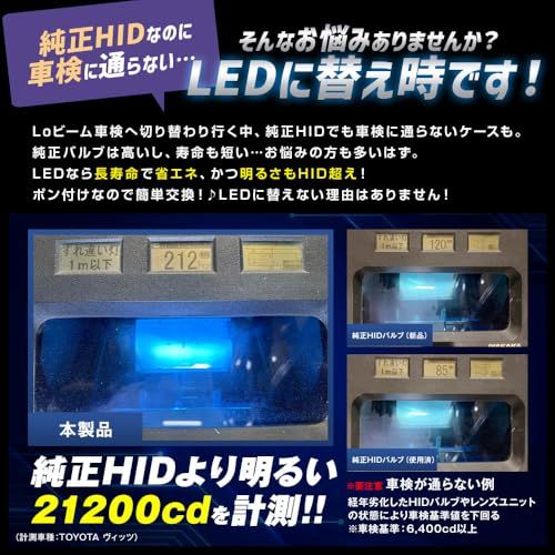 【純正HIDを超えた明るさ】8600ルーメン(2灯合計値)、カンデラ純正比170%超の明るさが障害物や路面の見やすさを向上させ、夜間運転の安全性を高めます。本製品のカンデラ実測値:21,200cdマーク!新品の純正HIDバルブとも比べ約170%超もアップ。経年劣化したバルブだと今年8月から完全移行するロービーム車検の基準値6,400cdに満たさないこともあり、その際、新品のHIDバルブに交換するよりも明るくなります。