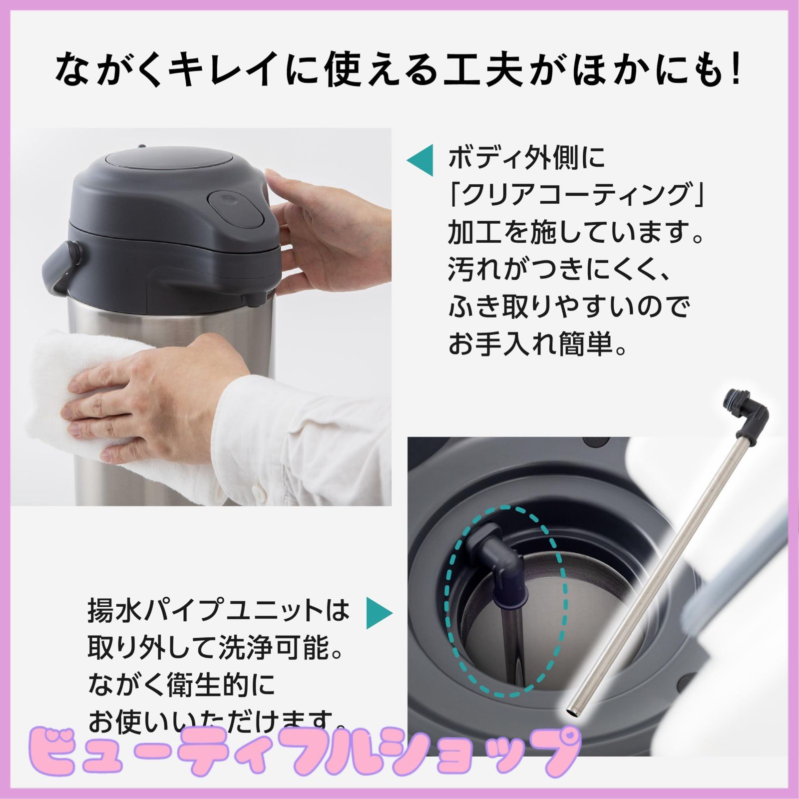 ステンレス製真空二重瓶でしかっり保温&保冷。●本体はステンレス製で耐久性に優れています。●エアー式給湯なので電源要らずで注げます。●口径約6.4cmの広口タイプで飲みものが入れやすく、お手入れも簡単。