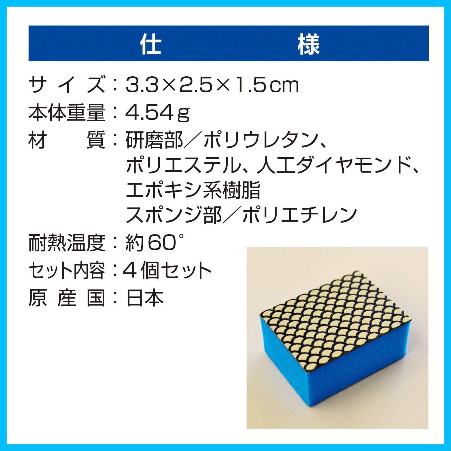 【仕様】サイズ:3.3×2.5×1.5 (cm) / 本体重量:4.54 g【材質】研磨部:ポリウレタン、ポリエステル、人工ダイヤモンド、エポキシ系樹脂 / スポンジ部:ポリエチレン / 耐熱温度:約60 度 / 原産国:日本 / セット内容:4個セット