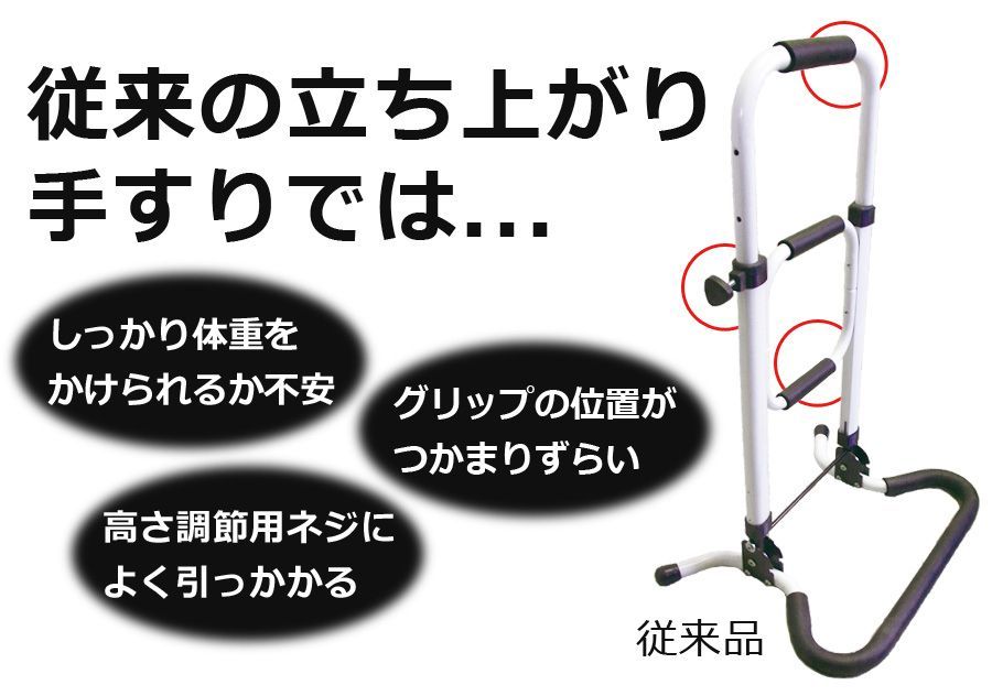 持ち運んでいつでも使える手すりが楽な立ち座りをサポートします。