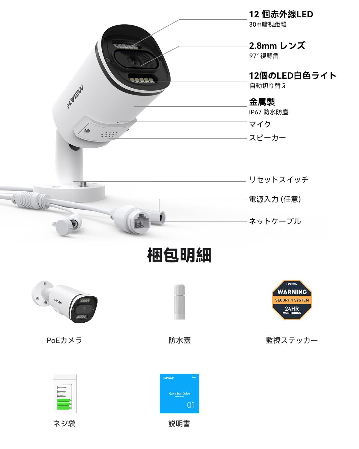 【人体検知・発光威嚇・双方向音声】H.View 防犯カメラ 有線 屋外 PoEカメラ 500万画素 PoE有線接続 5MP 監視カメラ 2.8mmレンズ ONVIF対応 2重灯付き 白色光ライト 投光威嚇 赤外線ライト 暗視撮影30M 人体検出点灯機能 双方向音声 音声マイク・スピーカ一内蔵 遠隔操作 スマホ/PC対応 IP67防水防塵 室内室外用 SDカード録画に対応できず(HV-500S2)