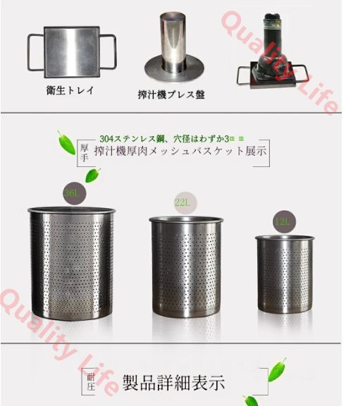高品質の素材: 当社のプレスのアウターバレルとインナーバレルはそれぞれ 201 ステンレス鋼と高品質の 304 食品グレードのステンレス鋼で作られており、耐久性と耐腐食性を保証します。亜鉛メッキ鉄パイプサポートと合わせて、鉄製ジャッキは長期間の使用を保証します。 - 機械のパフォーマンスの持続と衛生的なプレス環境。