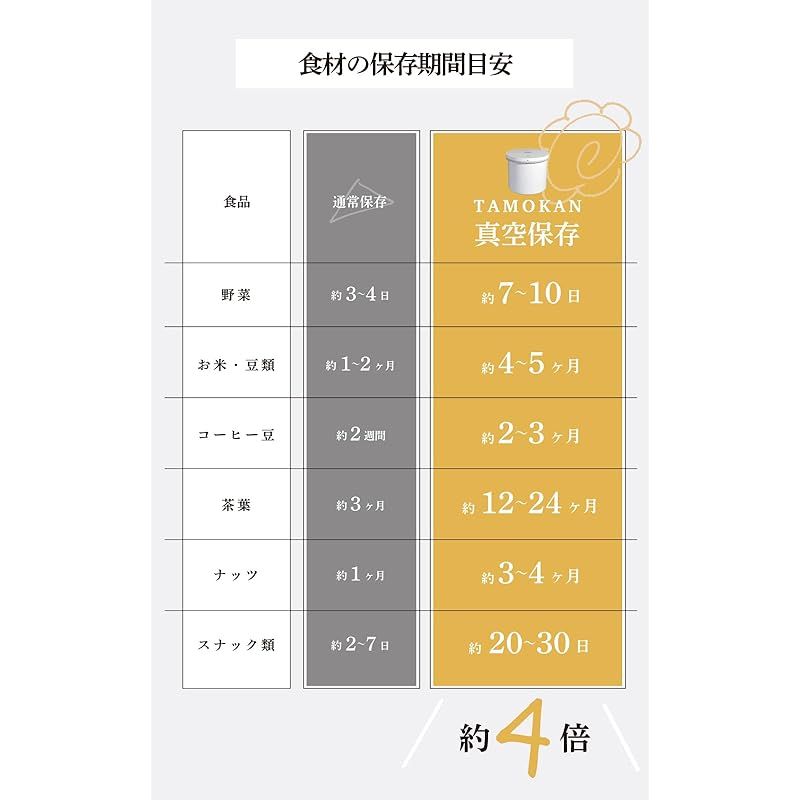 【鮮度を保ち、長く保存する真空保存容器】真空保存容器TAMOKANは食品や物品を空気から隔離し、鮮度や品質を長期間保つことができる容器です。空気を抜くことで劣化に繋がるさまざまな要因をブロックし、新鮮な状態をキープします。買い置きや、劣化を防ぎたいものの保管に役立ちます。