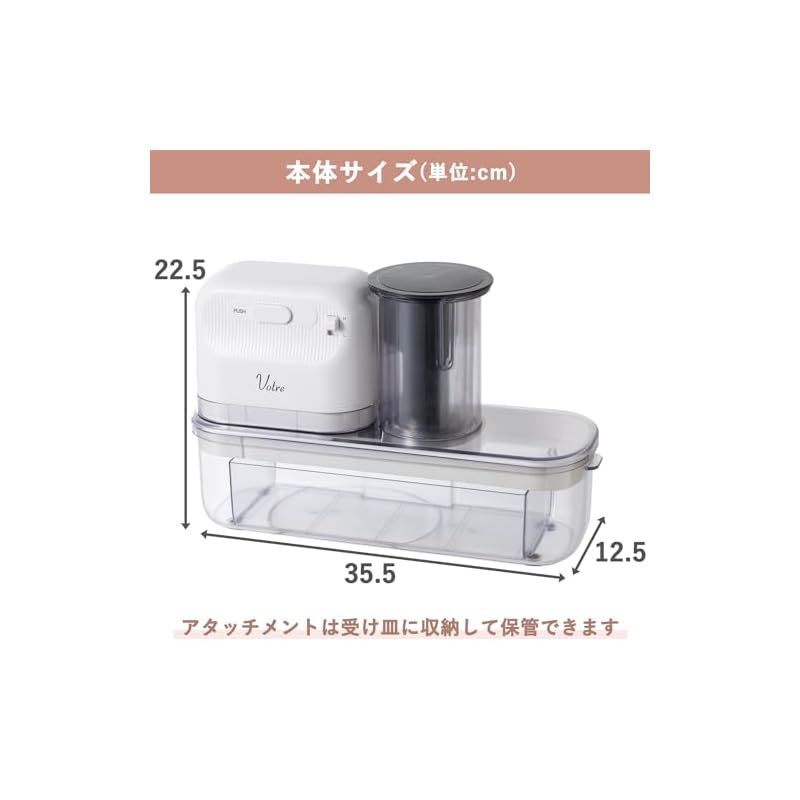【商品仕様】◇本体サイズ:幅33.5×奥行12.5×高さ22.5cm ◇本体重量:約2kg ◇電源:AC 100V(50-60Hz 共用) ◇消費電力:45W ◇定格時間:3分(3分使用ごとに2分以上休止) ◇電源コードの長さ:1.5m ◇アタッチメント:アタッチメントプレート(スライス刃兼用)、スライススペーサー、千切り刃、千切り刃、おろし刃プレート、プレート枠、枠台 ◇期間:お買い上げ日より1年間(の範囲については、取扱説明書をご確認ください。(一般家庭用以外(業務用など)に使用された場合の故障及び損傷などは対象外となります))
