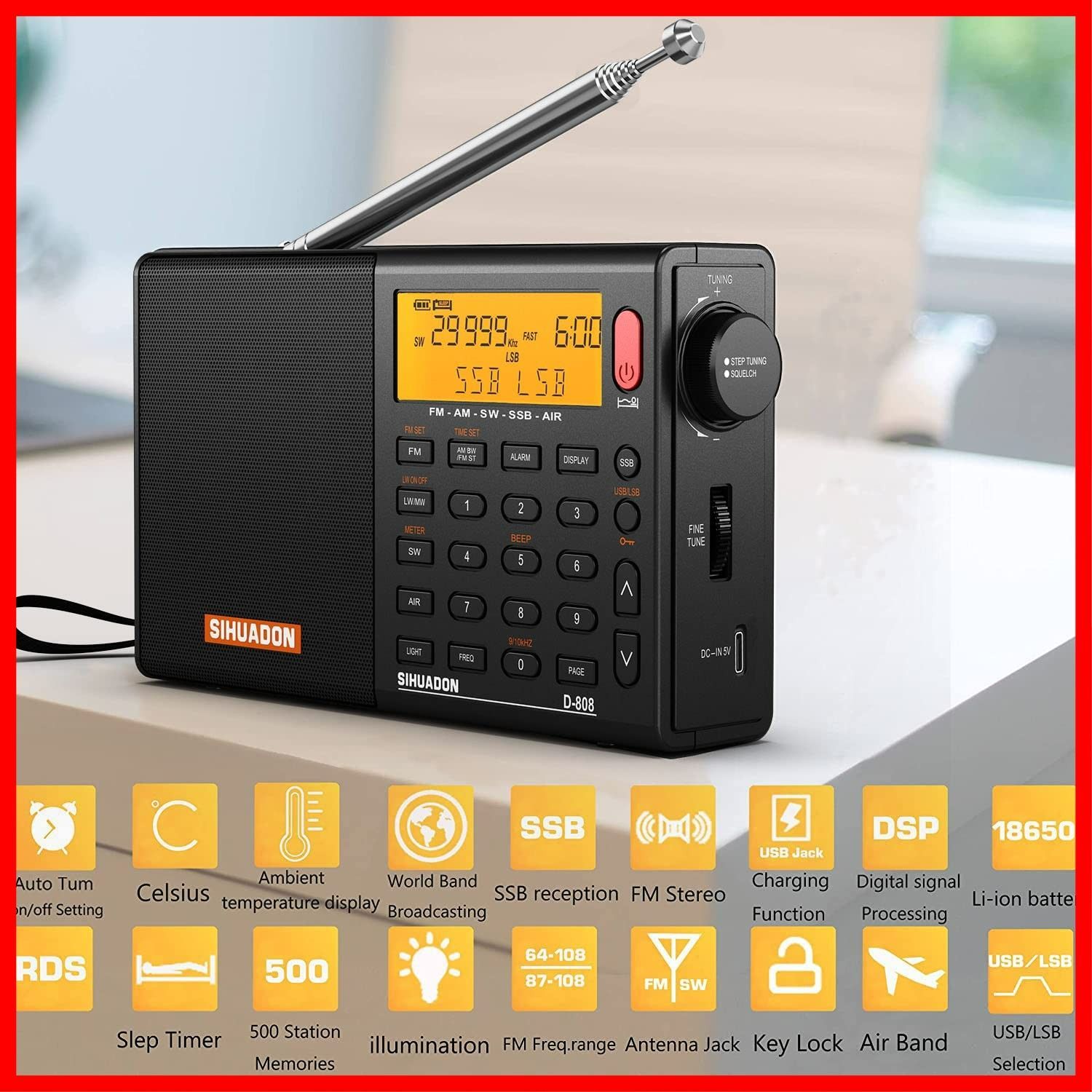 高感度 小型 SSB BCL DSP RDS 超軽量 ポケットラジオ 電池式 FM AM SW LW エアバンド 充電式 オートオフ機能付き ポータブルラジオ 操作簡単 D 808 日本語説明書付き