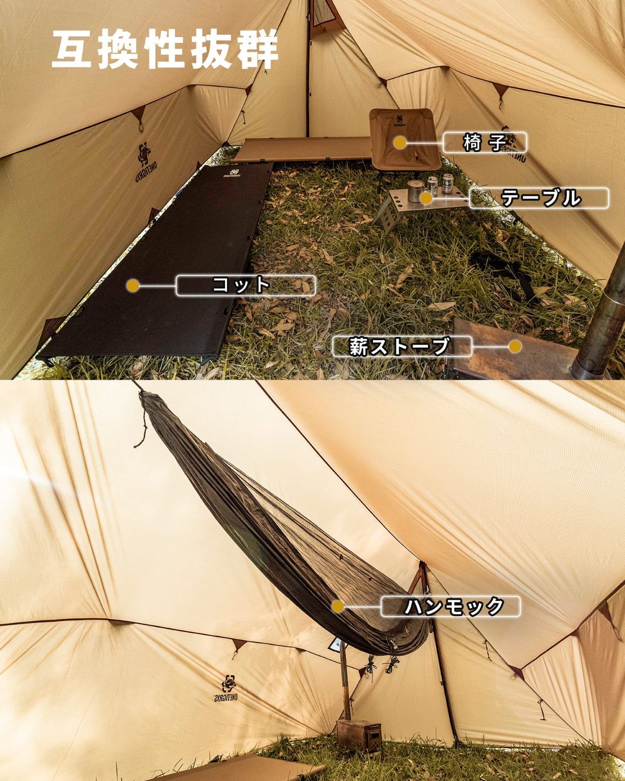 【フロアレスシェルター】この製品はキャンパーを風雨から完全に保護できるのタープです、パッケージには写真中のハンモックとテントストーブは付属していません、ご了承ください。