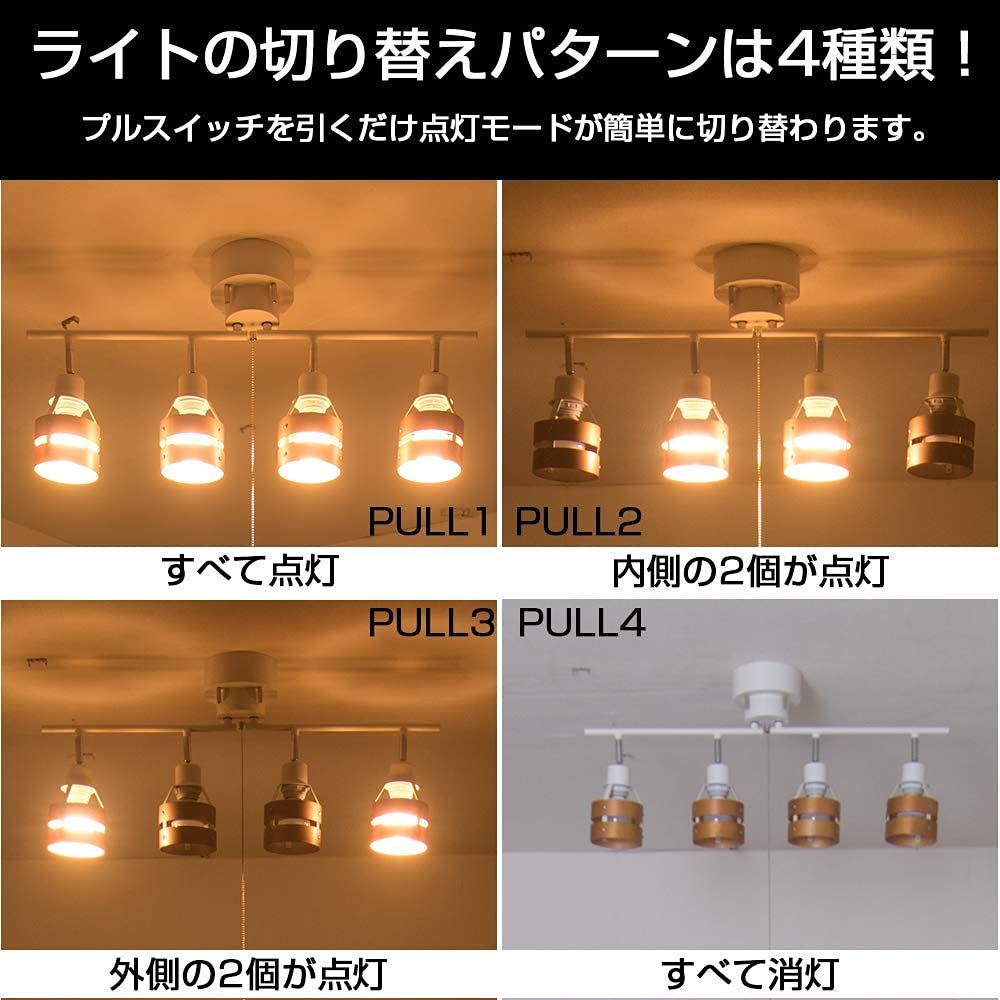 【プルスイッチ付属】:プルスイッチを引っ張ることで、点灯数を全灯→2灯→残り2灯→消灯の順番で切り替えることができます。壁スイッチのないお部屋にも利用できます。