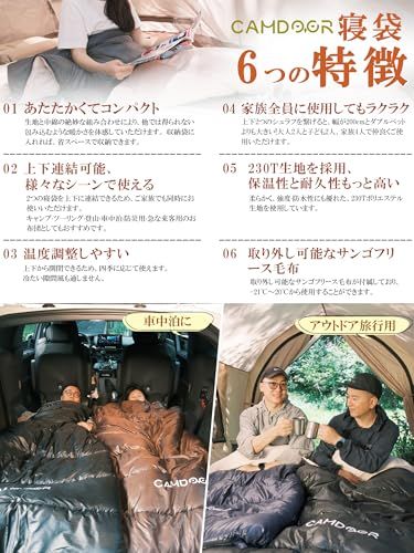 【2025年革新版寝袋 冬用&2個連結使用】Camdoor 寝袋には 6D ファイバー中空化学繊維が充填されており。型崩れしにくく、洗濯しても伸び縮みせず、伸縮性に優れた繊維です。。同じモデルの寝袋なら2つ上下に繋げ、 最大2枚で家族4人(子供2人)でご利用頂けます。寝袋には別途ブランケットが付属します。ブランケットのみひざ掛けや肩掛けとしても使えて嬉しい!
