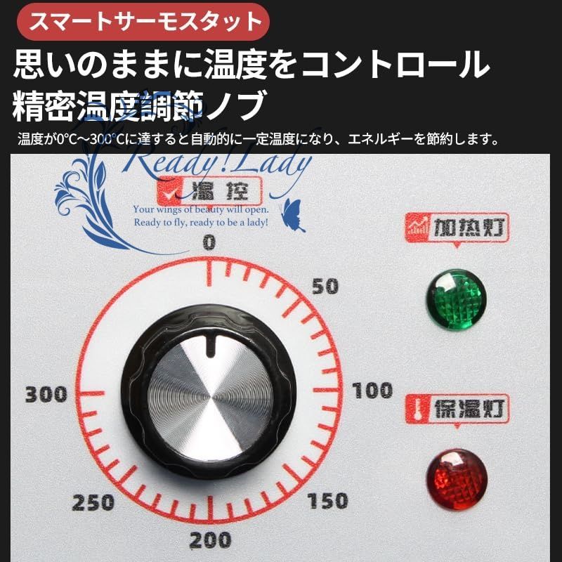 温度調節:50~300℃、ワンキー回転で自由に温を度調節する。設定値に達すると自動的にこの温度で温度を保ち、設定値を下回ると自動的に加熱して、食品の最高のおいしさを保つ。