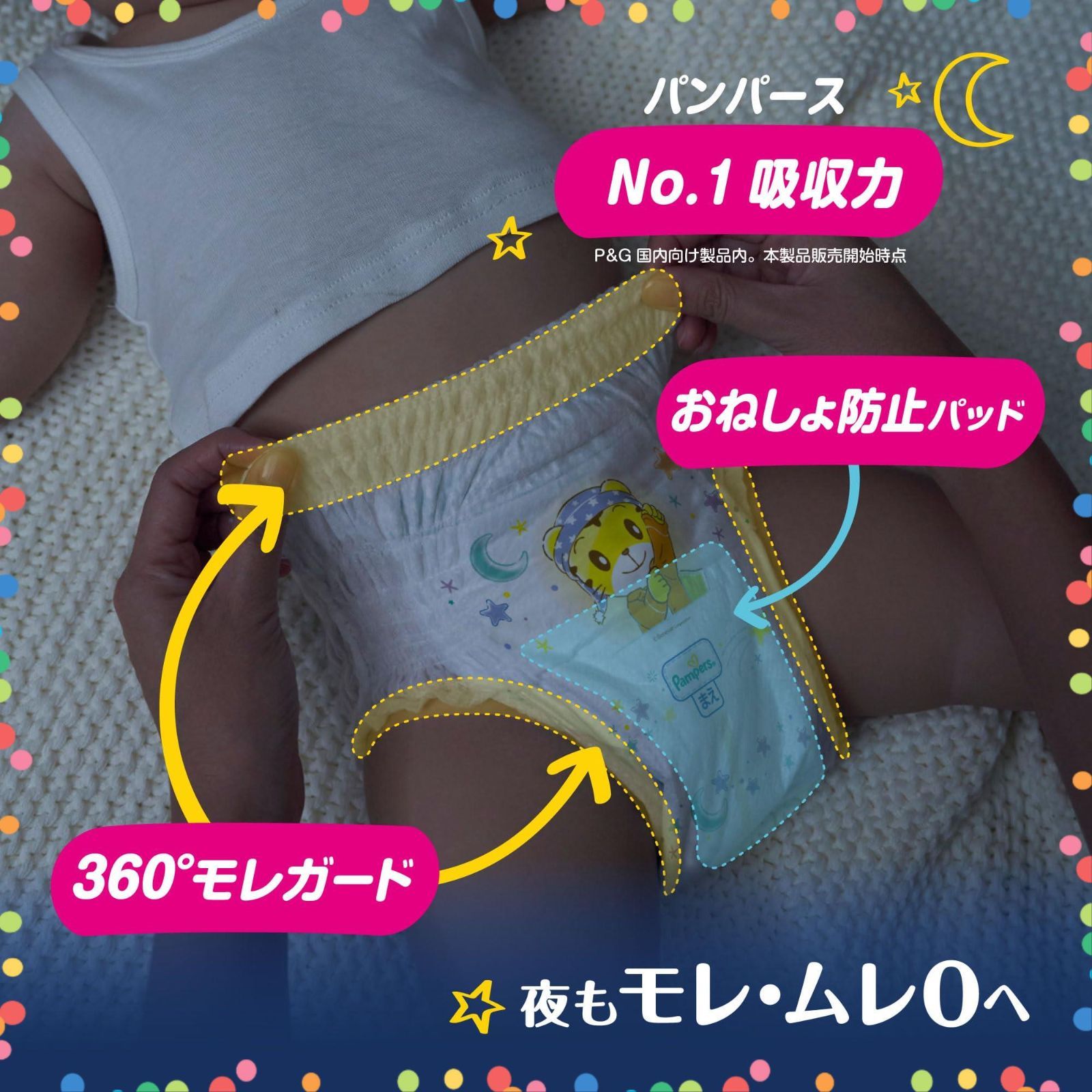 【パンパース おやすみパンツ おねしょ防止パッド新採用!】夜は昼の10倍モレやすい*。おねしょ防止パッドを搭載し、一晩中のおしっこを受け止めます。夜もモレ・ムレ安心。 * P&G調べ(Lサイズ N=115)