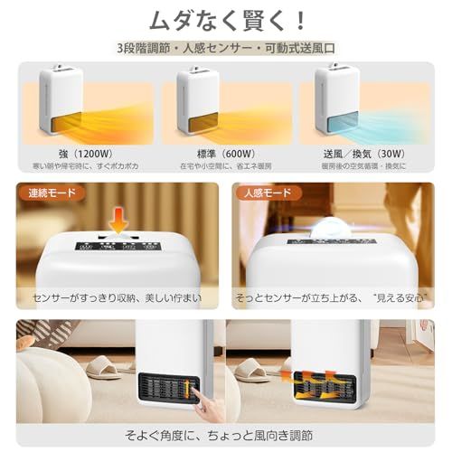 セラミックヒーター 小型 安全重視 新型 ファンヒーター 省エネ 600 W 1200 電気ヒーター 人感センサー付き 電気ストーブ 速暖 暖房器具 3段階温度調整 タイマー機能 転倒OFF 過熱保護 トイレ 脱衣所 寝室 足元用 2 fc 62 f 03