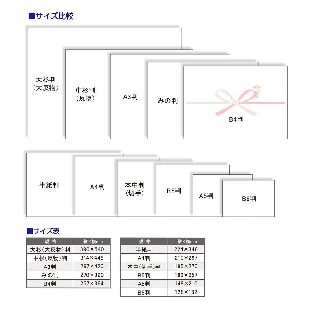 サイズはJIS規格A3判(297×420mm)で1冊100枚入、紙質はプリンター印刷に適した厚口の上質紙を使用しており、ネットショップや和洋菓子店、ギフト店での仏事用ギフトの包装にお使いいただけます。