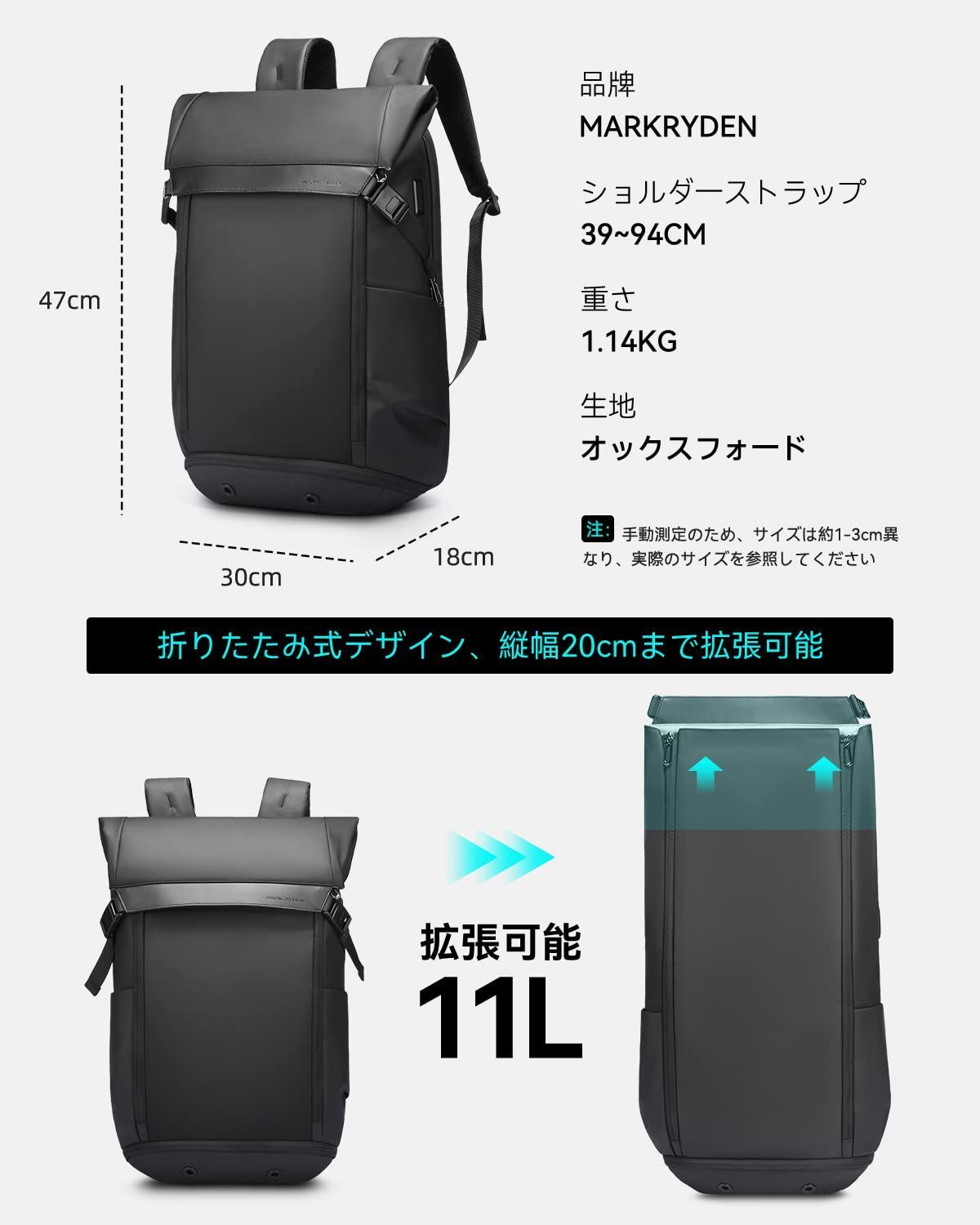 【25/36L リュック 大容量 拡張】サイズ:約縦47cm × 横30cm × マチ18cm、収納可能サイズ: 25-36L(物でいっぱいのすべてのポケット)、重さ:1.14Kg。スクエア型収納力抜群、最大17インチPC、Pad、A4サイズの書類や着替え、サングラス、帽子など必要なアイテムを、まとめて収納。キャンプや登山道具、旅行なら3~5泊分の荷物が余裕で入り.