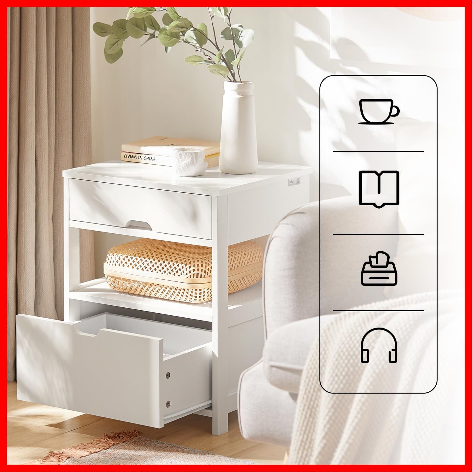 ??【お手入れ簡単&多用途】ラッカー塗装で、汚れにくく、水に濡れてもさっと拭き取ることができ、お手入れ簡単になります。ベッドサイドだけではなく、リビングに、ソファやチェアのサイドに置いて、書類、CD、資料の収納場、サイドテーブルとしても活用できます。