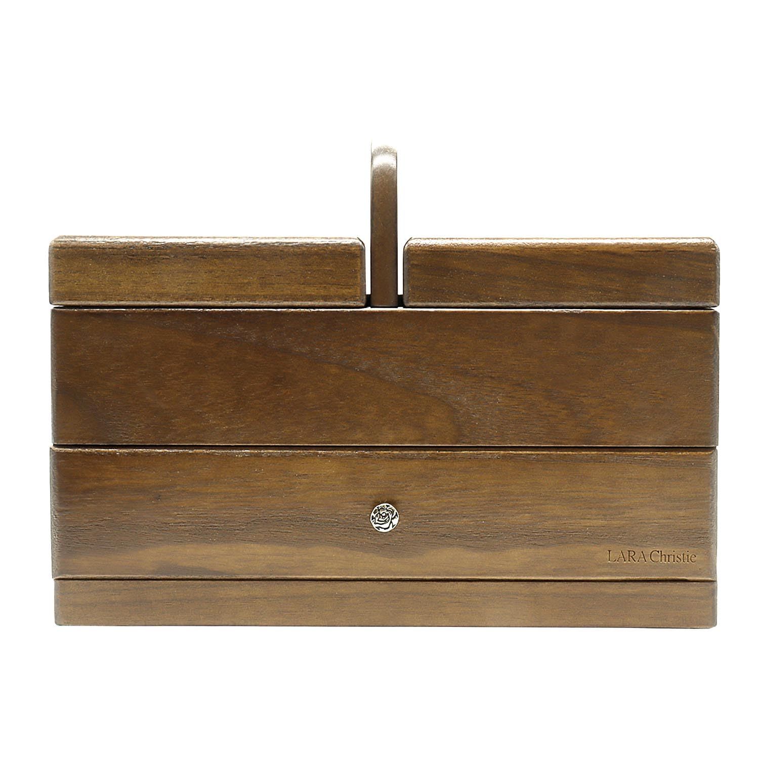 美しい木目がインテリアに溶け込む、オシャレでスタイリッシュなララクリスティーのソーイングボックス。どんな部屋もスタイリッシュでモダンな空間に。おしゃれな家具やこだわりの空間に馴染みにくい裁縫箱も、木製ケー スを使用することにより、ワンランク上のインテリア空間を演出。失くしてしまいがちな小さな裁縫用品や、布、ボタンなども、 すっきり収納できるのでとっても便利。ごちゃごちゃになってしまう裁縫セットをきれいに整理し、ササっと取り出しやすくします。上段は180度開けることが出来るので、小さなボタンや針などの一時置きにもお使いいただけます。使いたい時にサッと移動できる便利な取っ手が付いているので、 使いたい場所ですぐに使うこともできる万能なソーイングボックスです。