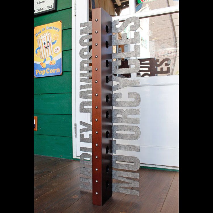 手作業で仕上げられたレーザーカットメタルの「Harley-Davidson」レタリングと、大変美しい木製のボトルホルダーの本体。