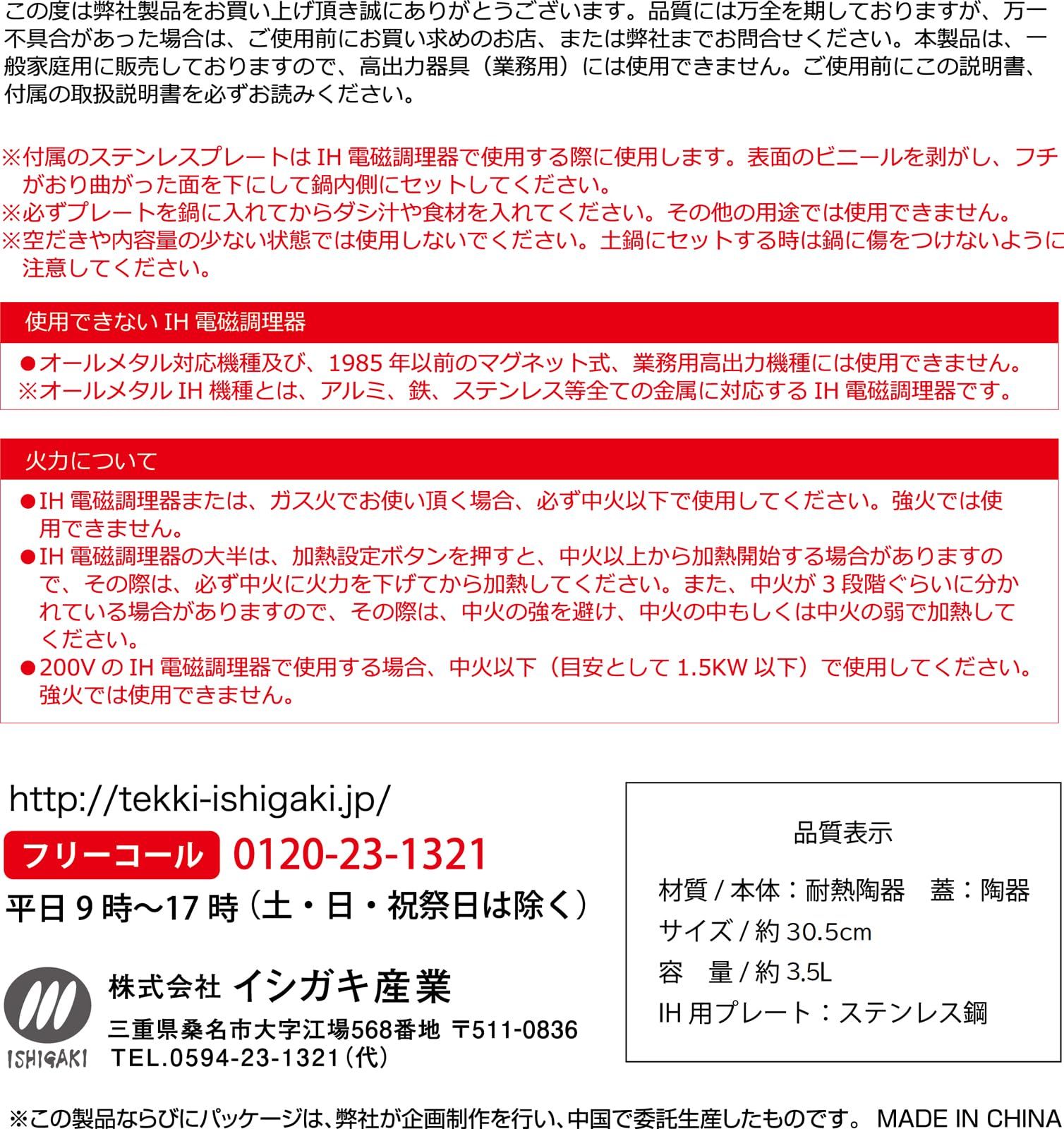 サイズ:約幅36cm×奥行30.5cm×高15.5cm(10号)容量:約3.5L(5~6人用)素材:(本体)耐熱陶器/(蓋)陶器/(IH用プレート)ステンレス鋼ブラックIH、ガス火対応可能