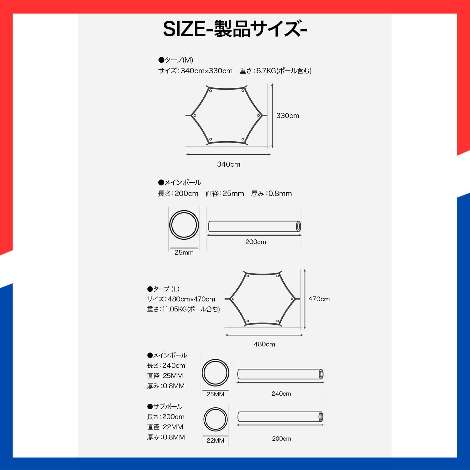 【製品サイズ】 サイズタープL:480cm×470cm 重量(付属品含む) Lサイズ:11.05kg(ポール含む)メインポール長さ:240cm直径:25MM厚み:0.8MM サブポール長さ:200cm直径:22MM厚み:0.8MM