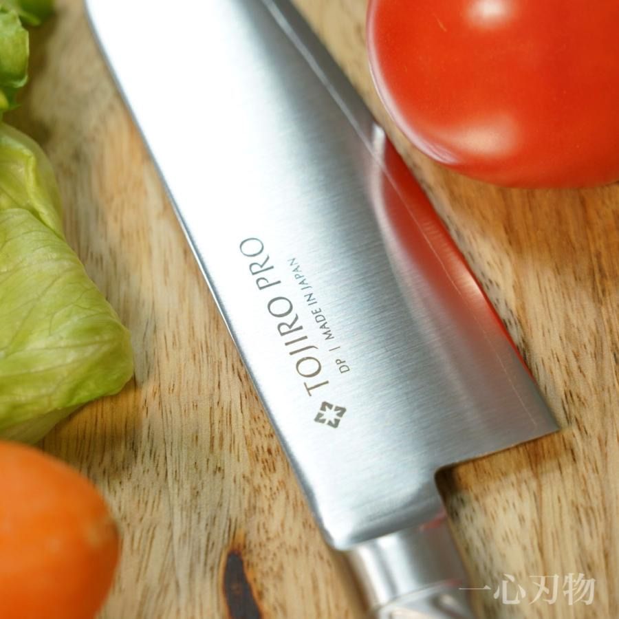 握りやすさ・滑りにくさ・衛生面を追求したトルネード模様のハンドルが特徴のTOJIRO PROオールステンレスシリーズ。刃のV金10号は医療用メスのモリブデンバナジウム鋼よりも硬くて鋭く、切れ味の持続性がさらに優れ、研ぎやすい高級刃物鋼です。