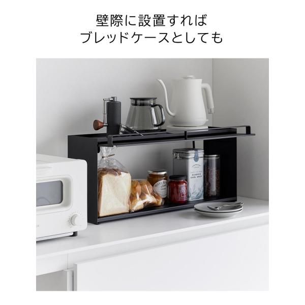 リビングからはスッキリ隠せて、キッチンからは使い勝手の良さが嬉しい。奥行き15cmのカウンター上収納ラックです。リビング側は全面が開くフラップ式の扉なので、中の物も取り出しやすいです。キッチン側は扉がないのでサッと物の出し入れがしやすいです。壁際に設置すればブレッドケースとしても使用できます。スチール製なのでマグネットが付き便利です。
