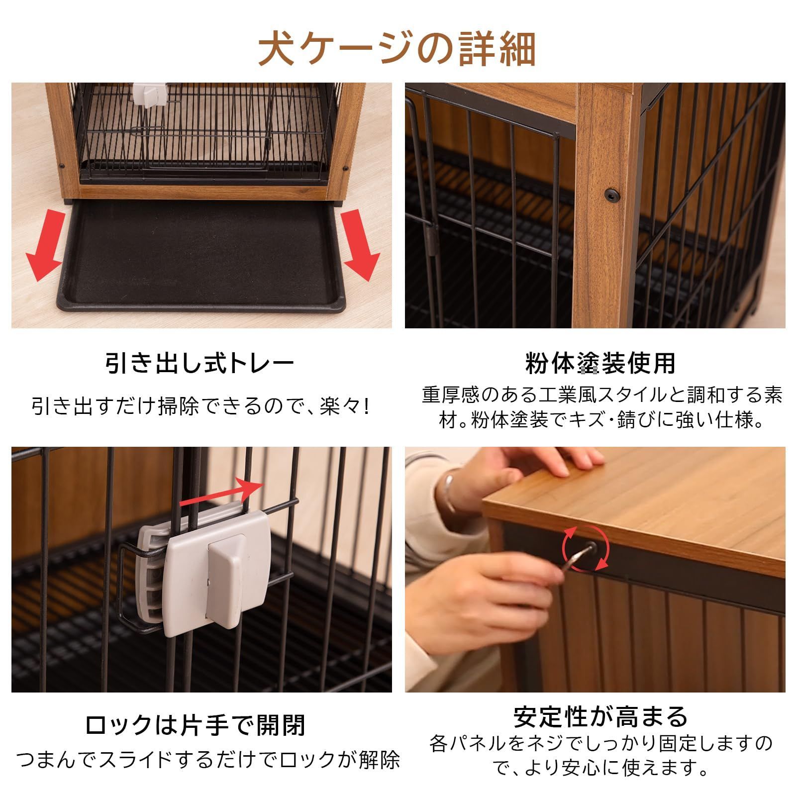 【お掃除が楽々 ペットケージ】床面のトレーはスライドして出し入れできるため、掃除やトイレシートの取り替えをスムーズに行えます。お掃除がラク!いつでも清潔感を持ち。