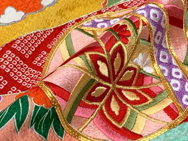 着物には吉祥模様である束ね熨斗が描かれており、裾前には金駒刺繍が入っています。