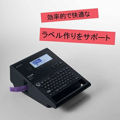高速印刷&静音設計で快適なラベル作成ができるラベルライター「テプラ」PROSR-R980。●ハッキリ・見やすい「360dpi×432dotの高精細大型印刷ヘッド」●軽快にラベル作成できる「高速印刷&静音設計」●ラベルのムダな余白を削減●テープ種類を自動検出。●特殊なデザインラベル作成に便利な「フォーム機能」搭載●パンドウイット共同開発「カットラベル・パンドウイット」に対応◇製品特長1.最大印字可能幅がアップして、大きくハッキリ表示可能!360dpi・432dotの高精細大型ヘッドとアウトラインフォントで、印字を大きく美しく印刷できます。従来機種(SR970)に比べて最大印字可能幅が30.5mmになり、最大で14行の多行印刷も可能です。2.ラベルの無駄な余白を削減!従来機種(SR970)と比べて、ラベルを印刷した際の無駄な余白が少なくなりました。ラベル1枚につき、前後の余白が約10mmから約4mmに短くなります。1本のカートリッジからより多くのラベルを作成できるようになり経済的です。※一部非対応のテープがあります。※余白やカットの設定などにより削減幅は異なります。3.テープ種類を自動検出しラベル作成をもっと簡単に!「テプラ」PROテープカートリッジをセットすると、テープの種類を自動で識別できるようになりました。テープの種類に合わせて、印刷の速度や濃度、自動カットなどを最適な設定で印刷することができるだけでなく、それぞれに合わせた印刷フォーマットや特殊印刷メニューを呼び出します。各種設定を一つずつ操作する手間が省け、効率的なラベル作りをサポートします。4.特殊なデザインラベル作成に便利ファイルの見出しや備品管理など、ビジネスでよくつかう「ビジネスフォーム」のほか、LANケーブルやネットワーク配線機器の管理表示用ラベルに特化した「ケーブルフォーム」を追加搭載しました。また、インダストリー・ネットワーク配線機器メーカーのPanduitCorporationと共同開発されたケーブル表示に特化した「カットラベル・パンドウイット」にも対応しています。同梱品:取扱説明書(保証書付き)、ACアダプタ(AS1527J)、試用PROテープカートリッジ、ヘッド・クリーニングテープ(SR36C)使用電源:付属ACアダプタ、単3形アルカ乾電池×6本(別売)、単3形ニッケル水素電池×6本(別売)※小さい文字、画数の多い漢字、ゴシック体などの太い文字に「飾り字」を指定すると印字のツブレが起きることがあります。※本機には単3形アルカリ乾電池または充電式ニッケル水素電池をお使いください。その他の電池は使用できません。※精密機械ですので取扱いにご注意ください。※直接日光の当たる場所や、高温・多湿の場所での使用または保管はしないでください。※本製品に登録したデータは、長期的・永続的に保存することはできません。本製品の故障、修理、検査、電池消耗などに起因するデータの損失および逸失利益につきましては当社では一切その責任を負いかねますのであらかじめご了承ください。※本製品は日本国内専用です。【検索ハッシュタグ】#キングジム#テプラ#テプラプロ#テプラPRO#ラベルライター#SR-R980