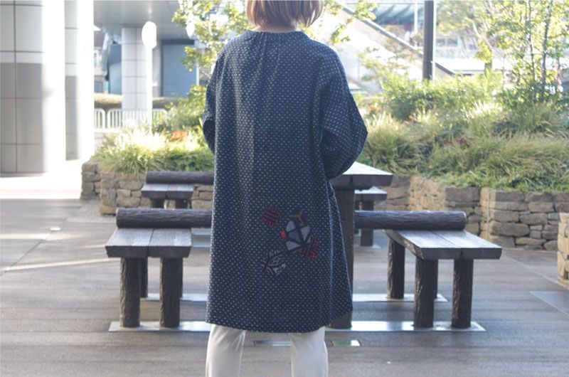 051204 15 1 三角模様 安曇野 F ゆったり 婦人服 大きい 11号~13号相当 藍染め風 和柄 おしゃれ割烹着 久留米絣パッチワーク ホームウエア