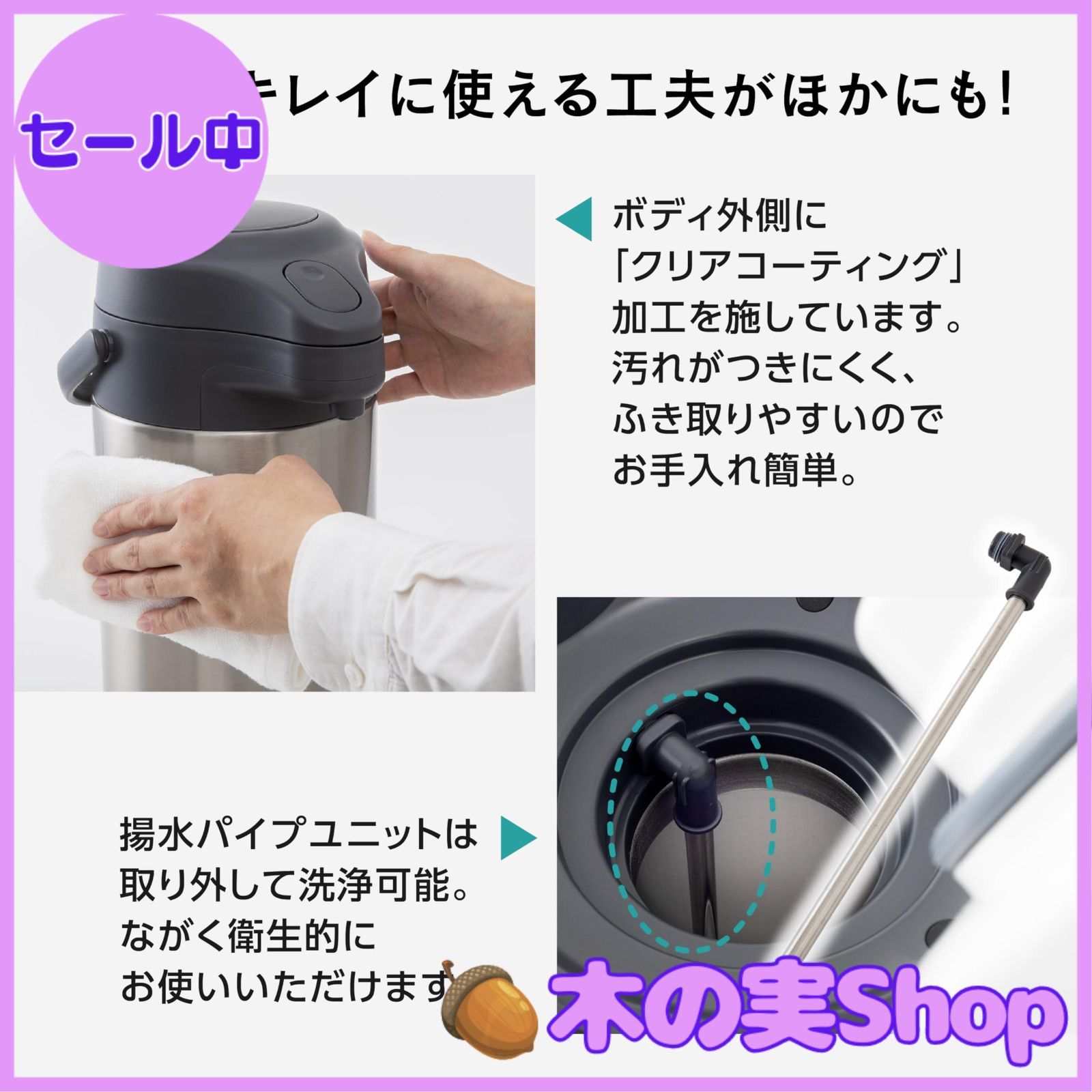 押しやすい大きなプッシュプレート●中せんなし構造なのでやかんからの給湯に便利●持ち運びに便利な可動式のハンドルが付き●上ぶたは着脱式でお手入れがしやすい●電気を使わず省エネ