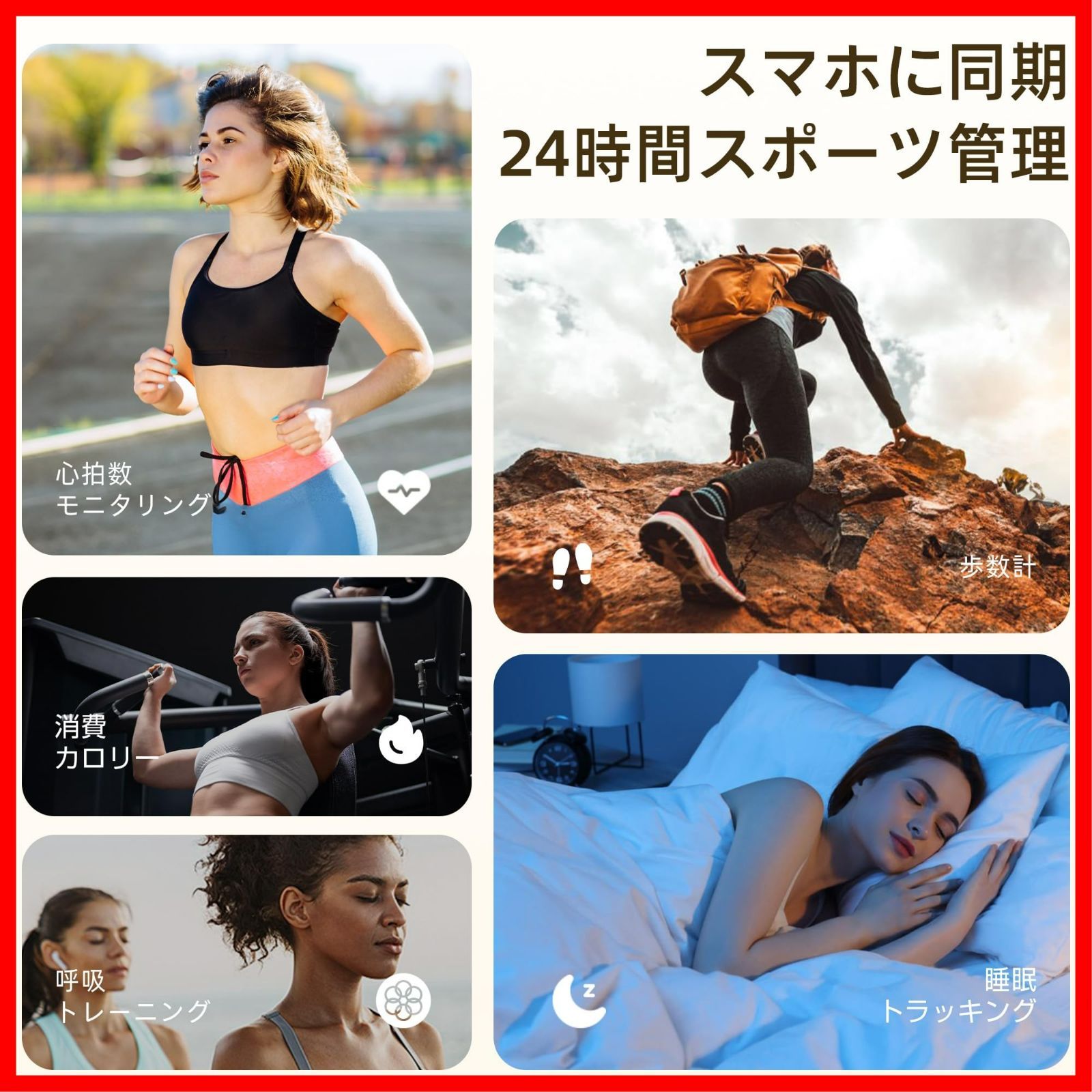多彩な運動モード・睡眠追跡・スマホにデータ同期:このスマートウォッチには屋外および屋内のランニング、バスケットボール、サイクリング、野球、ヨガ、スキップ、バドミントン、テニスなどを含む 100 以上のスポーツモードが付属しています。GPS内蔵され、毎日の歩数や距離、カロリーを記録するだけでなく、座りがち注意、リラックス、睡眠質を記録などの機能も備えています。更に、女性の月経周期の記録と通知機能も揃えます。専用アプリ通じでスマートフォンと連動すると、アプリの中でも自分の運動軌跡、データの変化を直接見ることができます。毎回の運動状況を詳しく理解して、タイムリーに調整することができて、運動の積極性を高めることができます。