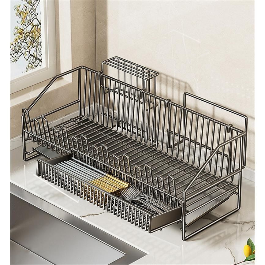 大容量水切りラック 自動排水トレー 包丁立て付き