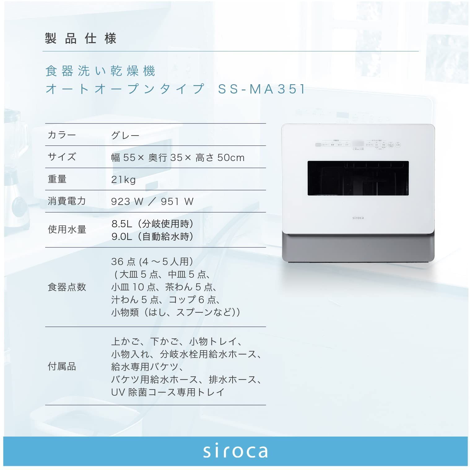 SS MA 351 2 WAY食器洗い乾燥機 4~5人用 オートオープン機能 バケツ給水 食器36点 UV除菌 食洗機 工事不要 分岐水栓可 タイマー6段階設定 おまかセンサー搭載 グレー シロカ