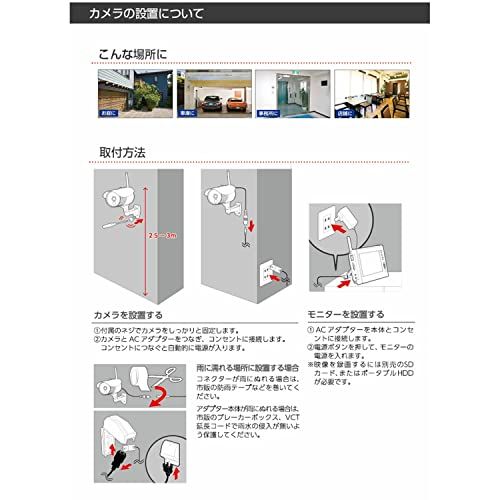 モニターとカメラ間の配線不要 専用アプリでスマートフォンやタブレットからかんたんモニタリング ワイヤレスで映像を送信 2.4GHzデジタル 映像をメディアに録画できるSDカード/HDD録画 4台まで同時録画可能 耐水型カメラ(IP66) 夜間暗視 15m 自動で録画やアラームも可能 充電して屋内を持ち運べる バッテリー内蔵モニター