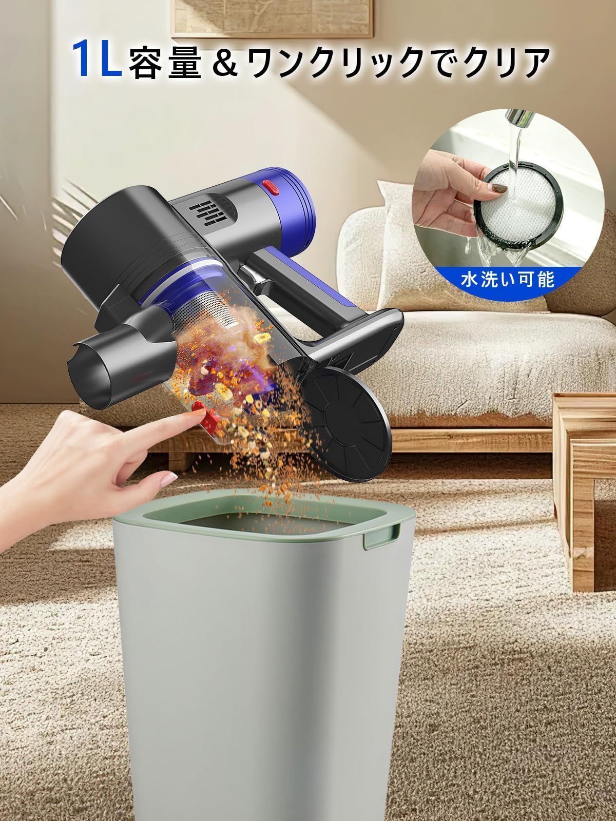 【驚きの60Kpa超強力吸引&強弱切替】 当該掃除機は先端には600Wブラシレスモーターを採用し、吸引力が普通の掃除機より50%に高めます。 部屋の狭い隅、微細なほこり、車内ゴミ、花粉などのゴミを速やかに吸い込み、綺麗に掃除できます。コードレス設計で、家中のどこでも持ち歩きやすいです。操作が簡単で、これから掃除に二度と悩まりません。緑- 髪の毛や紙くずなど掃除、イエロー- 各種の床清掃任務に適し、レッド- カーペットを深く清掃することができます。ホコリから猫砂までぐんぐんしっかり掃除でき、家事の悩みから解放されます!強い吸引力を軽々使える。きれいな排気で、心地いい毎日へ。