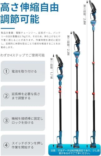 【多重安全保護機能の搭載】:高枝切り電動チェーンソーには、二重ロックシステムが備わっており、誤操作を防止します。高枝ポールには、意図しない落下を防ぐ安全装置が装備されています。この高枝切り電動チェーンソーの使用では、安全が常に最優先されます。