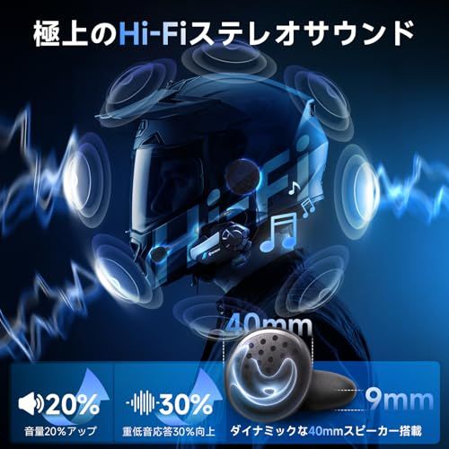 【HIFI音質アップグレード?大音量・高音質・臨場感】H2S ヘルメット用インカムは40mm高性能HIFIスピーカーを搭載し、音の細部まで忠実に再現。DSP・CVC・ENCのトリプルノイズキャンセリング技術と防風設計マイクにより、周囲の騒音を最大98%低減。高速道路や時速120km走行中でも、ワイヤレスインカムからの通話やスマホ音楽をクリアに楽しめます。