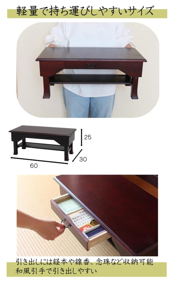 オスマック(OSMAC) 経机 引き出し付 文机 仏壇台 幅60×奥行30×高さ25cm 折りたたんで収納可能 供物台 供養台 写経机 便利机 天然木桐製 ブラウン SXDX-600BR