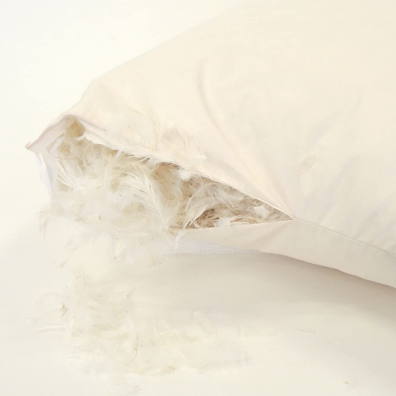 水鳥の羽根(フェザー)をたっぷり詰めています。ポリエステルわたと違い、弾力性はあまりませんが、ゆったりみをあずけられるようにお使いいただくと、フェザーならではのしっとりと沈み込む感覚を体感いただけます。※こちらの商品は圧縮した状態で発送いたします。