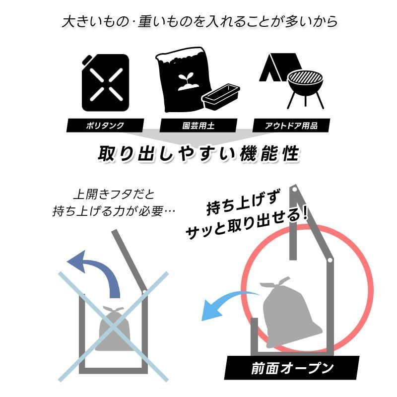 頑丈かつ高耐久なアルミ製。さびにくい塗装を施しており、外に置きっぱなしでも問題ございません。大きかったり重たいものでも取り出しやすい「前面オープン式」扉を採用。