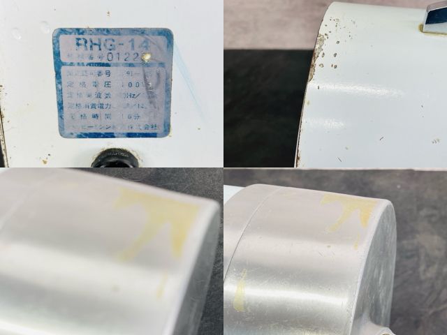 側面全体に傷サビ跡あり、正面上変色したシール、蓋内側全体に黄ばみ、脚サビ傷汚れなどがあります。脚ゴムにひび割れがあり、側面のネジの黒い部分が片方ありません。