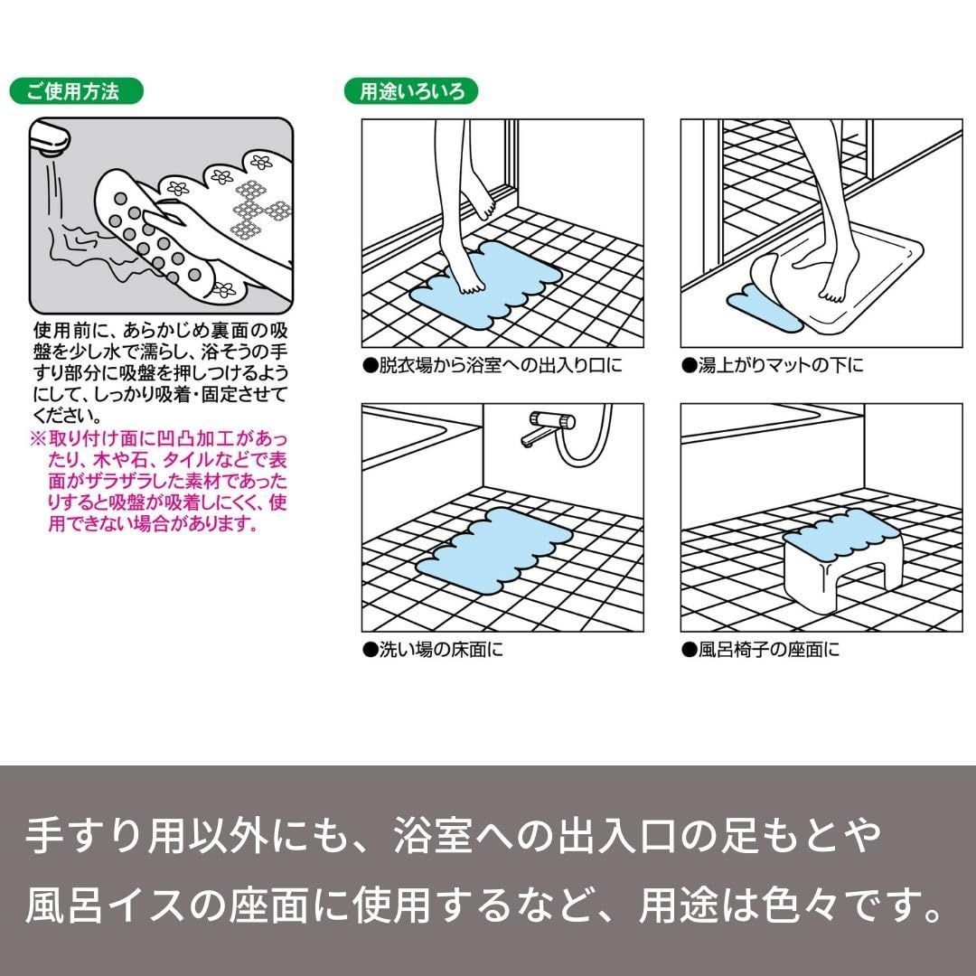 【コンパクト】ミニサイズで、浴槽のフチや手すりにぴったりフィット。吸盤で自由に貼り付けられるので、ミニサイズのマットとして浴槽内や洗い場、脱衣所やトイレの手すりなど、転倒が気になる箇所にどこでもお使いいただけます。(吸盤がつかない箇所へ貼り付けることはできません。)