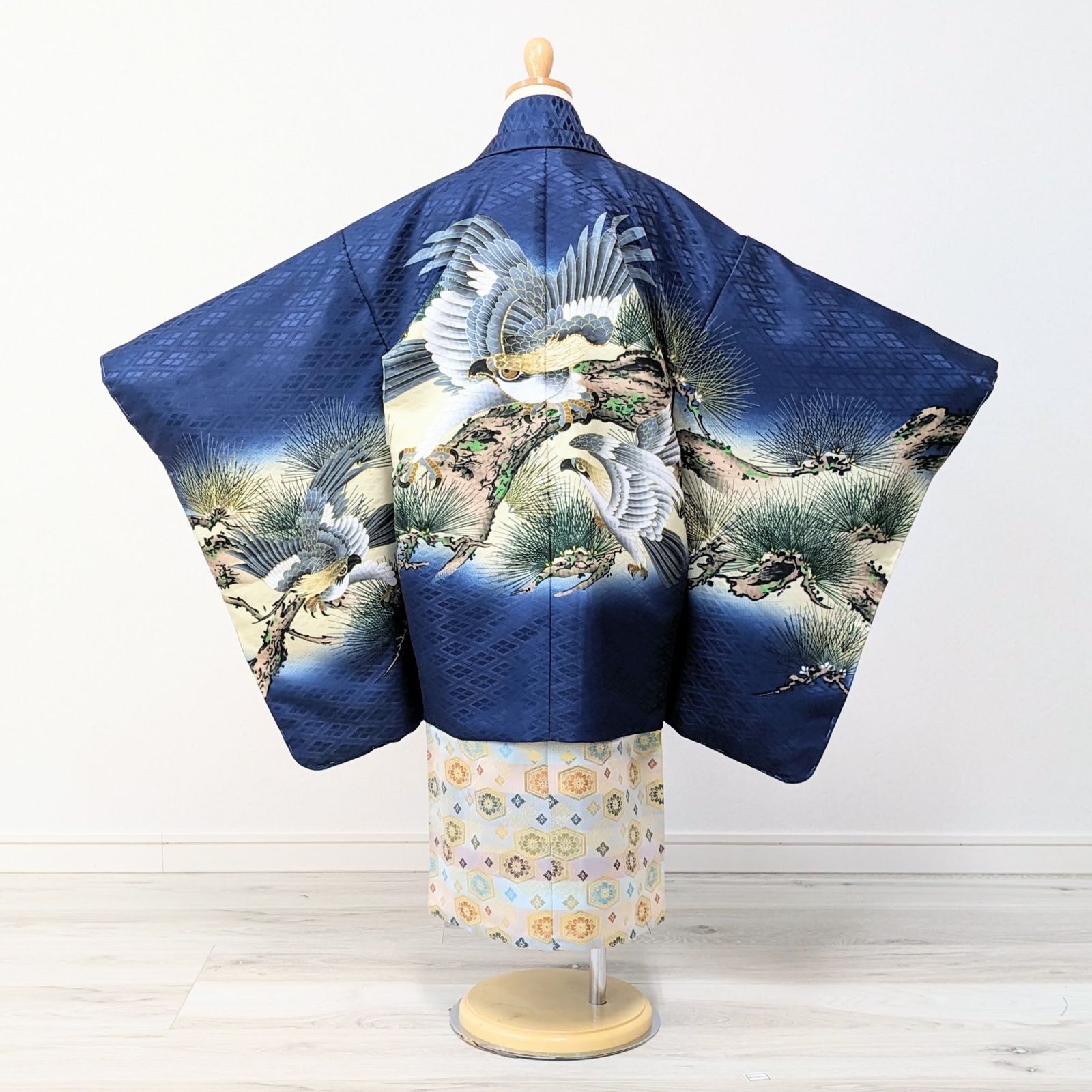 カッコいい紺地に鷹の、着物・羽織・袴の一式セットです。