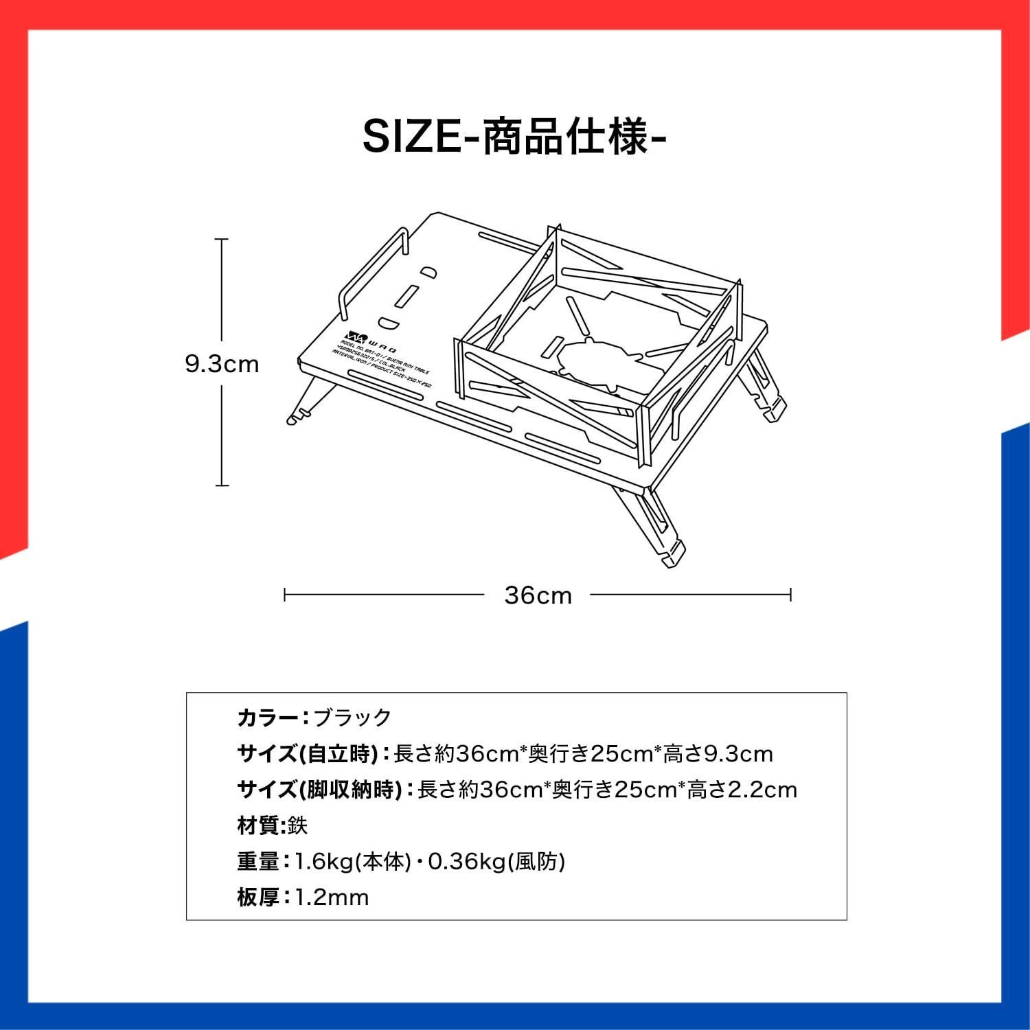 【商品仕様】「カラー」ブラック「サイズ」自立時:約36 x 25 x 高さ9.3cm 脚収納時:約36 x 25 x 高さ2.2cm「重量」約2.0kg「材質」鉄「内容品」本体 / 風防4枚 / 収納袋 / 日本語説明書 ※本製品にシングルバーナーは付属いたしません。